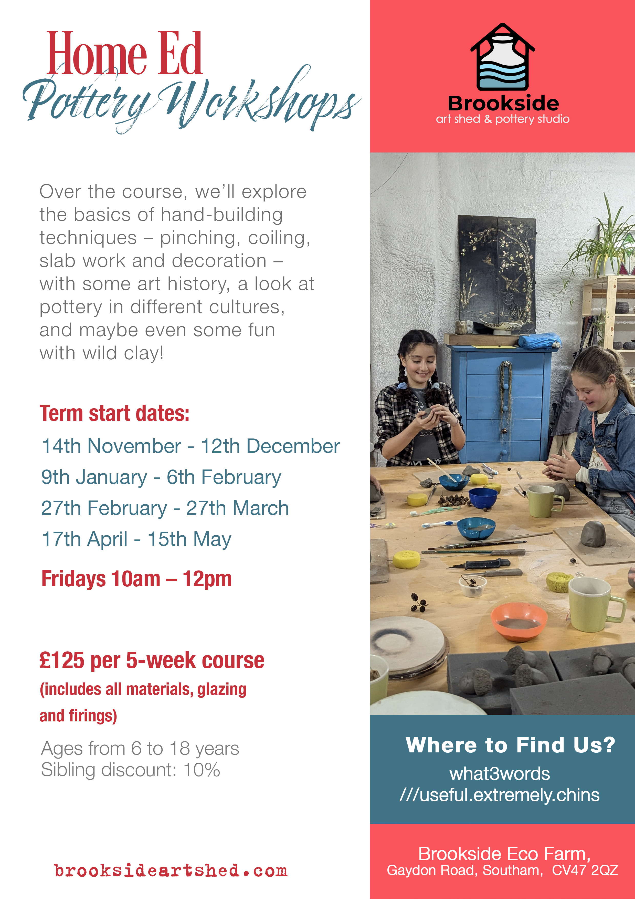I’m Pippa Prosser and I run Brookside Art Shed, an art and pottery studio near Bishops Itchington. I am offering 5-week pottery courses (for ages 6+) to run throughout the year. The next course dates are: