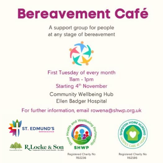 New Bereavement Cafe on first Tuesday of each month, 11am to 1pm at the Community Wellbeing Hub, Ellen Badger Hospital, Stratford Road, Shipston on Stour.